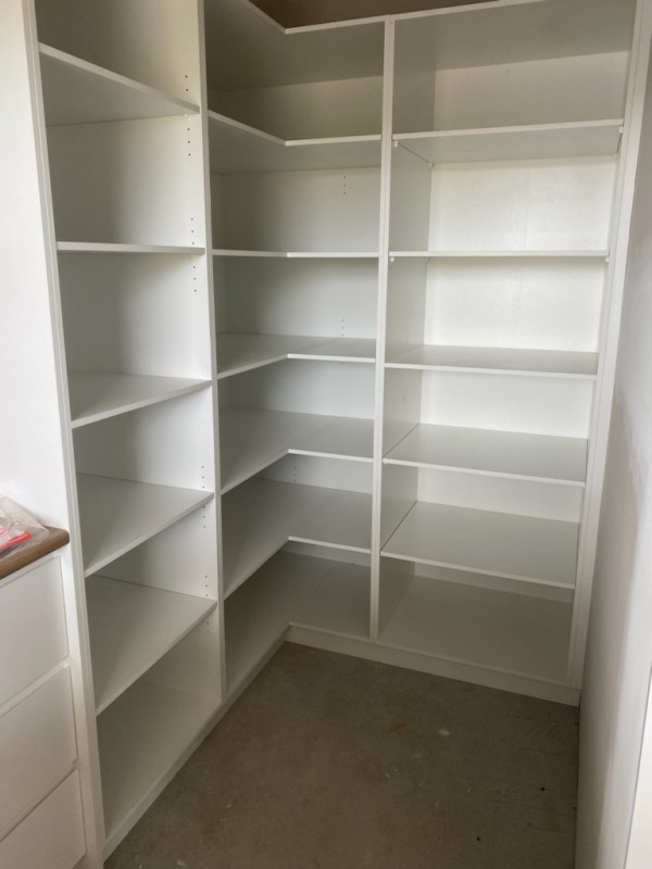 The overall project included a Butlers pantry in behind the oven side with a timber look bench top Polytec Prime Oak Woodmatt and Classic White open shelving