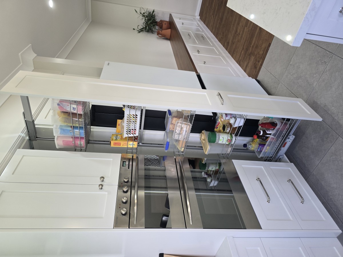 Pull out wire ware storage was implemented to make better use of space by way of accessibility and functionality.