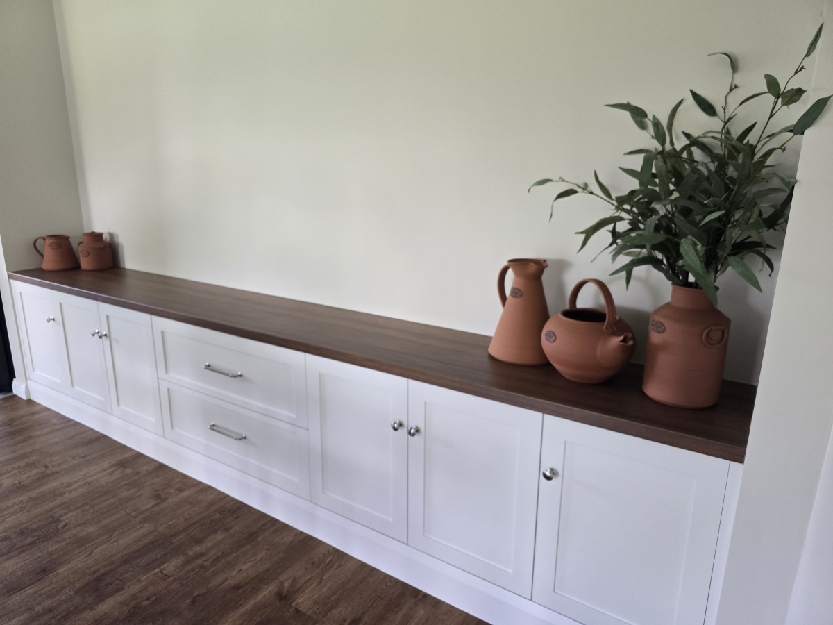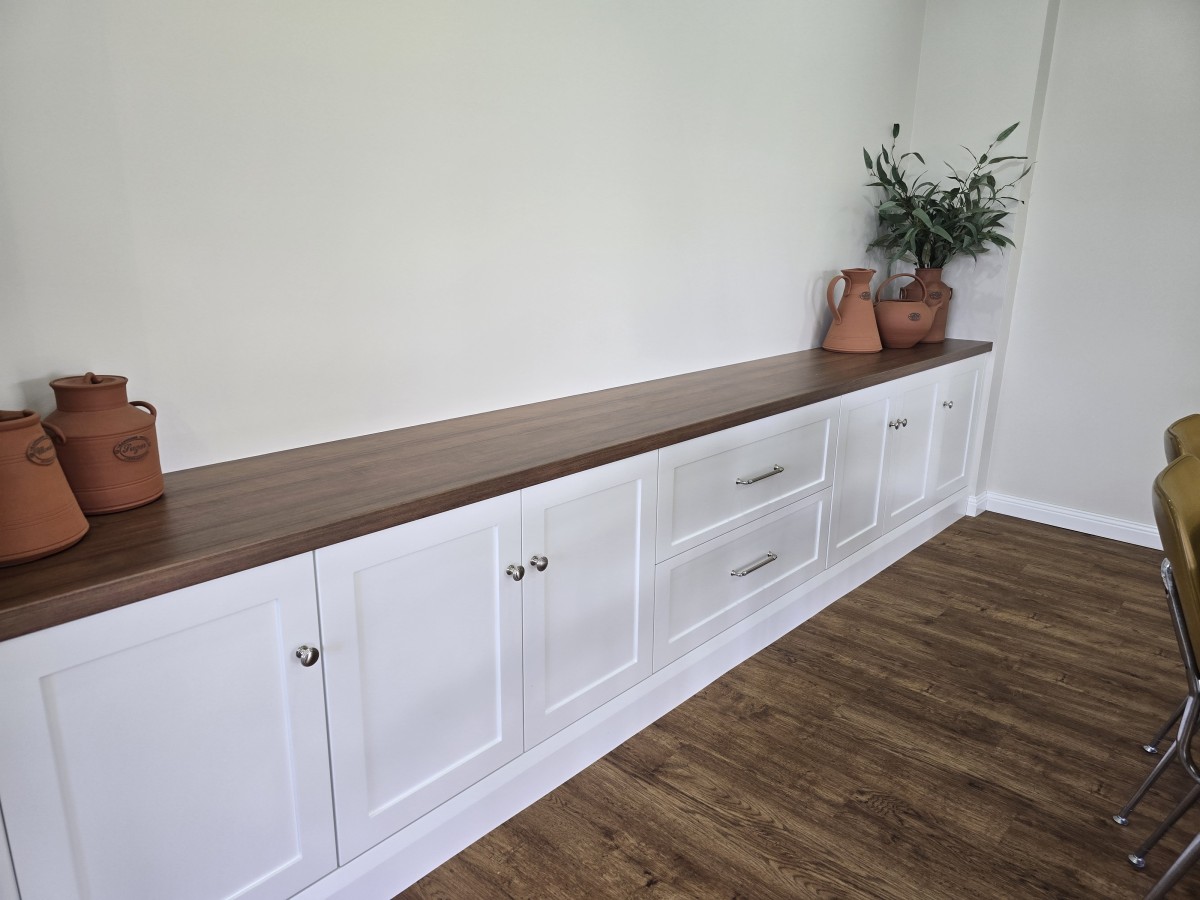 With the addition of a dining room low boy in the same door style as the kitchen and with a natural timber look bench top has completed the renovation of kitchen and dining room.