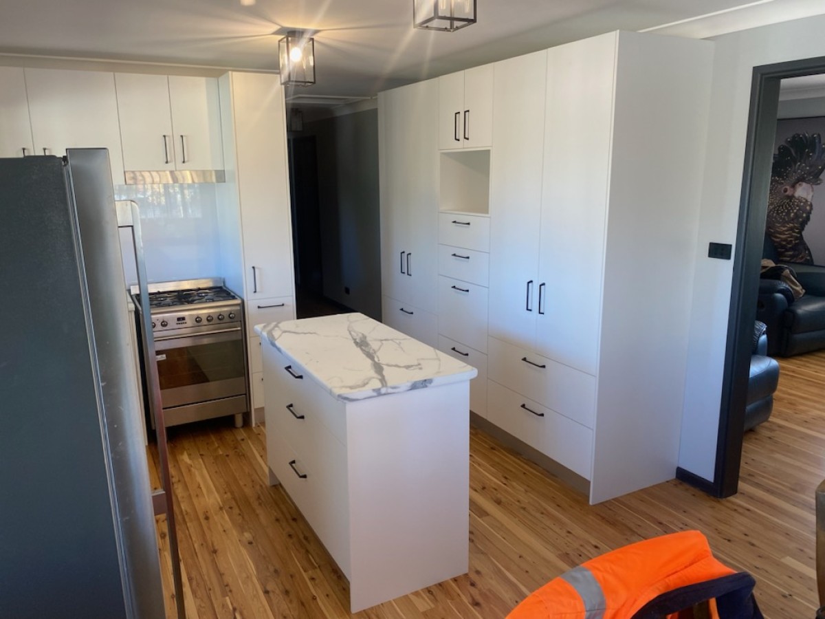 The finished project was striking against the newly polished pine flooring. The space was very constraint, however we made it all work and is now a really functional space for the couple.