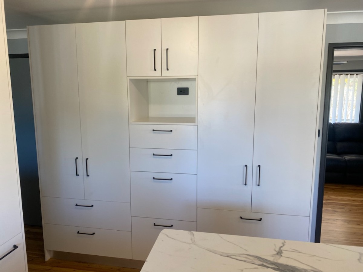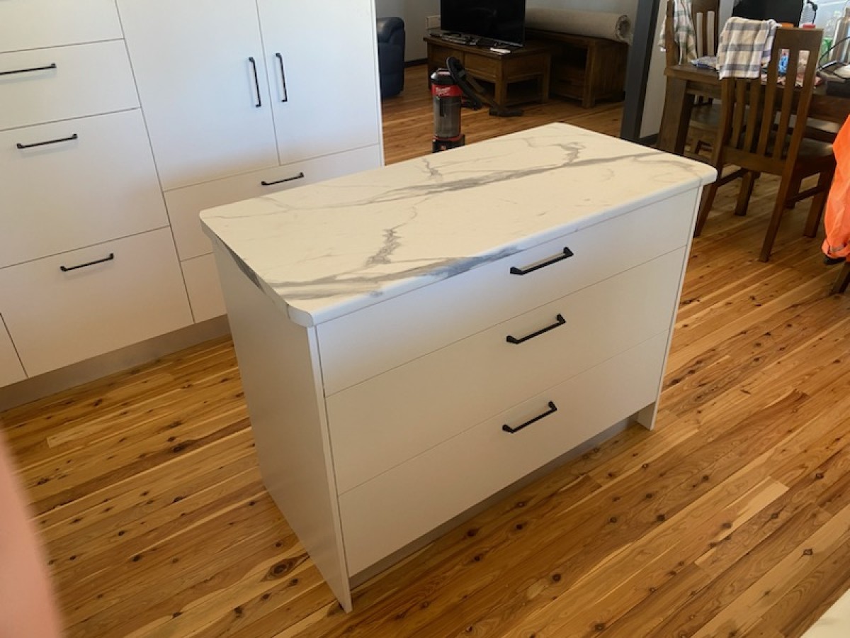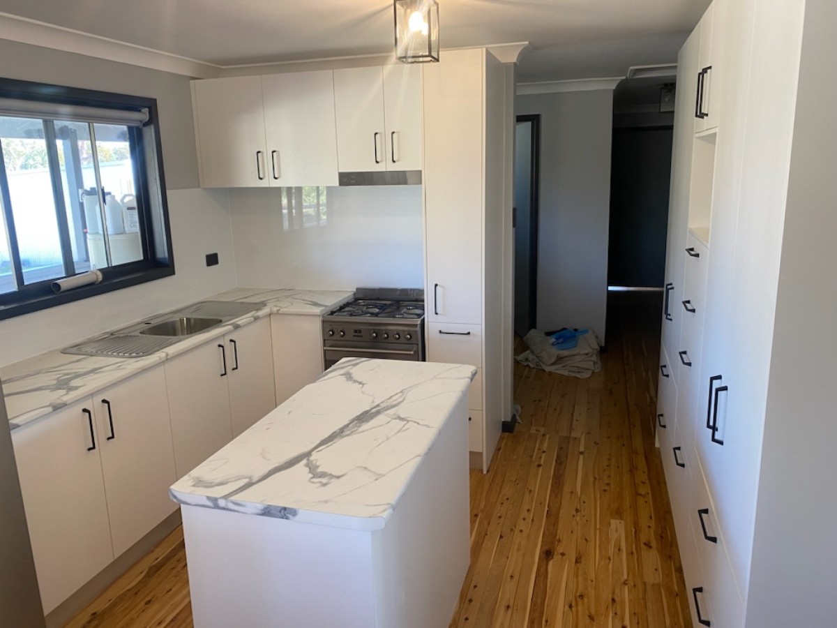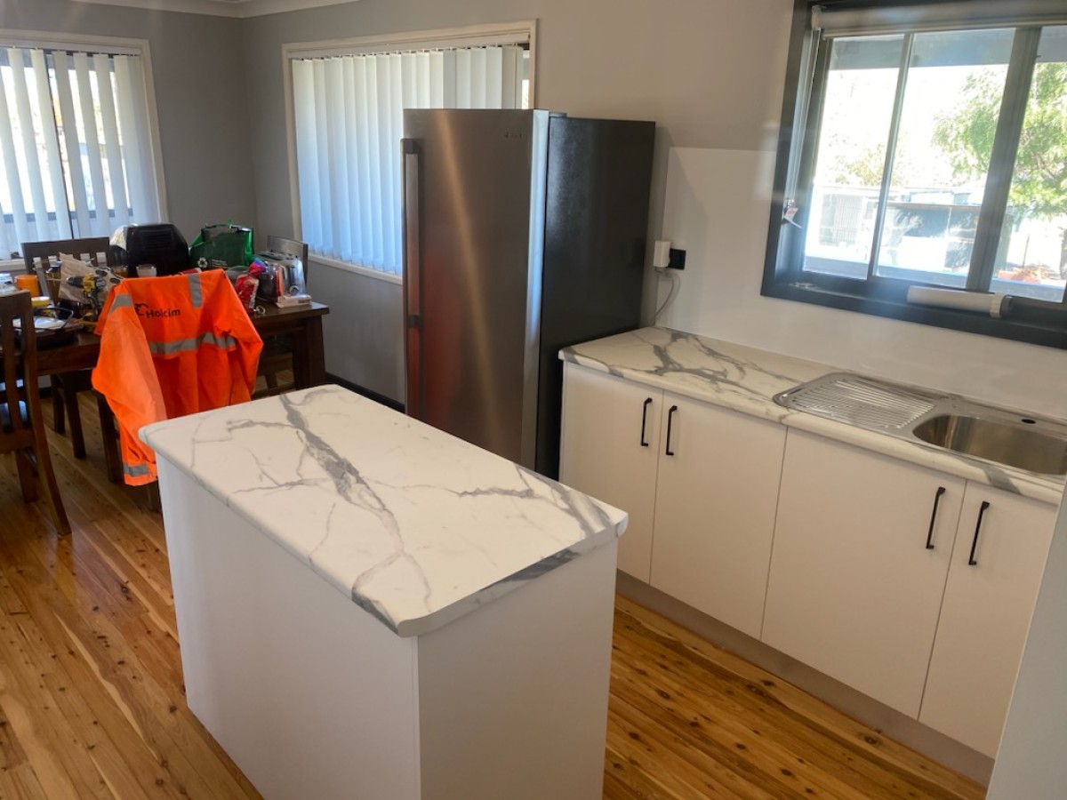 A lovely couple from Ashford engaged us to renovate their old outdated kitchen, they had a good idea of what they wanted and chose from some classic colour combinations of Calacutta Grey Marble tops and Classic White melamine doors.