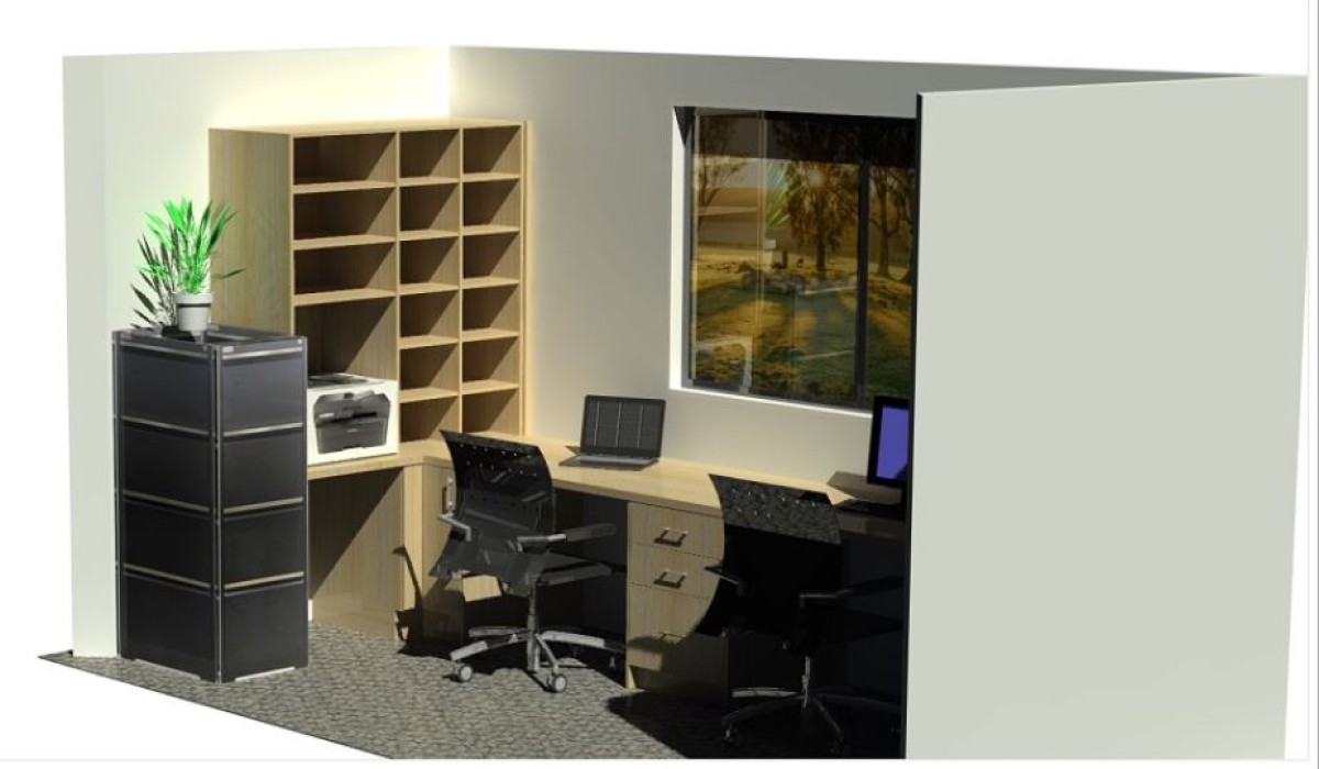 We are working on the clients new office. This is positioned close to the walk in wardrobe so it was decided they would use the same materials, being Polytec natural oak matt finish and brushed nickel handles.