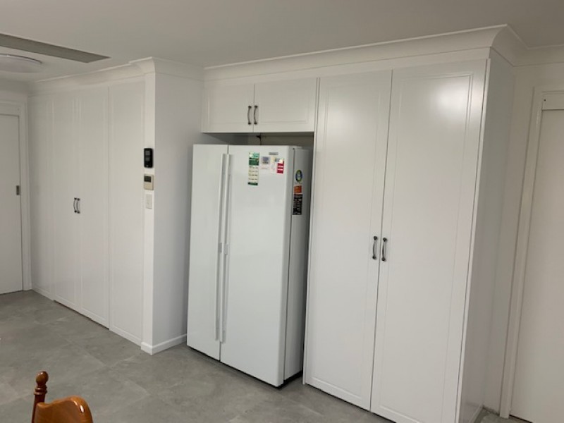 It was time to refresh the original kitchen, including making slightly more space with a clever rebuild by shifting the fridge away to the right to make way for a walk in type pantry featuring stepped back surround shelving.